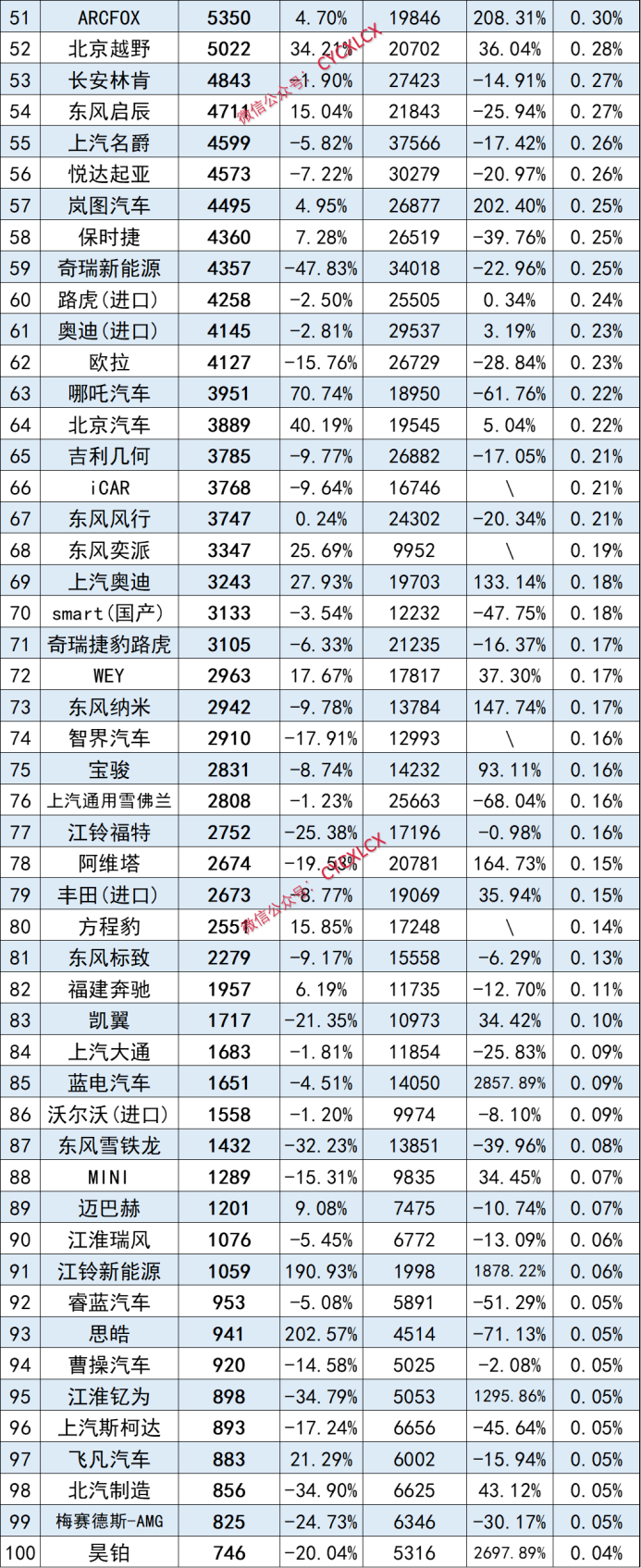 而从前百的角度来看,在整体销量出现增长的情况下,月销量不足一千的品牌数量却增多,可见销量增长的大头大部分都集中在了排名前列的品牌身上,这对于名声不显的品牌来说并不是好事,在国内汽车市场中生存的压力变大了。