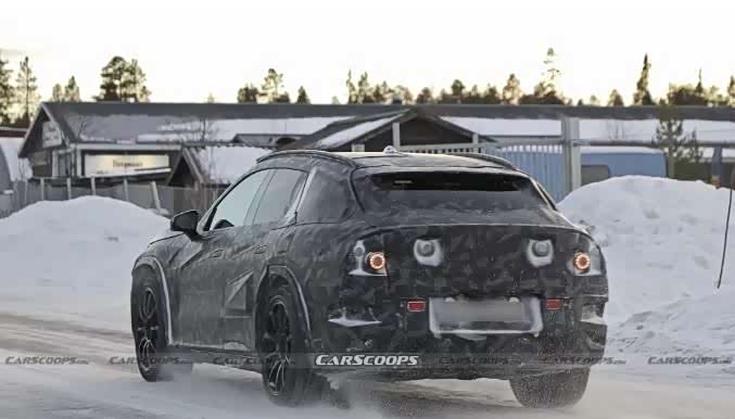 尾部造型方面,车顶配备有小尺寸的扰流板和高位刹车灯。尾灯组目前还是临时装配,内部结构立体感较强,但具体样式还需等待量产版揭晓。牌照框区域采用了内凹式设计,点缀出了车尾的层次感。下包围部分的伪装程度较高,具体细节还无法判断,但预计会采用运动化的设计元素。