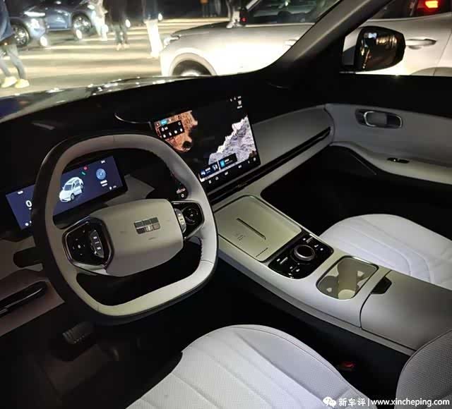 新车配备了两幅式方向盘、悬浮式仪表盘和中控车机,前排马鞍区域还有模式切换旋钮,以及手机无线充电面板。