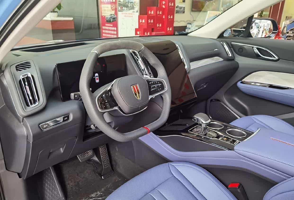 内饰方面,全新红旗HS3采用了经典的环抱式座舱,左侧是平底三幅式多功能方向盘,前方是12.3英寸全液晶仪表盘和中控竖向布局的12.6英寸显示屏,空调出风口尾翼显示屏的两侧,除此之外几乎看不到物理按键,整体布局简洁又不失科技感。