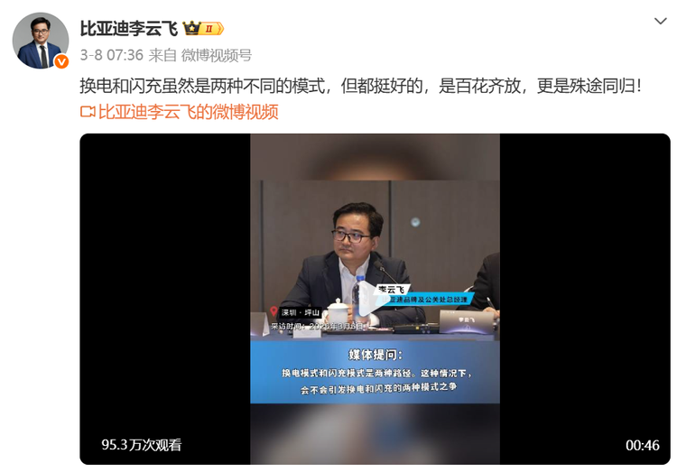 比亚迪品牌及公关处总经理李云飞、蔚来CEO李斌,纷纷亮明自己的立场、守住自家路线;就连奇瑞汽车董事长尹同跃,也忍不住发声“站队”,加入了这场补能之争。