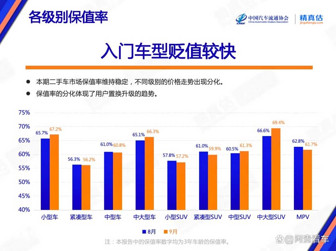 具体来看,9月中小型车、中大型车、中型SUV以及中大型SUV的保值率环比均有涨幅。其中,中大型SUV涨幅最为明显,由66.6%升至69.4%,增长了2.8%,紧凑型车、中型车、小型SUV、紧凑型SUV和MPV则略有跌幅,而紧凑型SUV和MPV则下滑较为明显,环比下滑了1.1%。