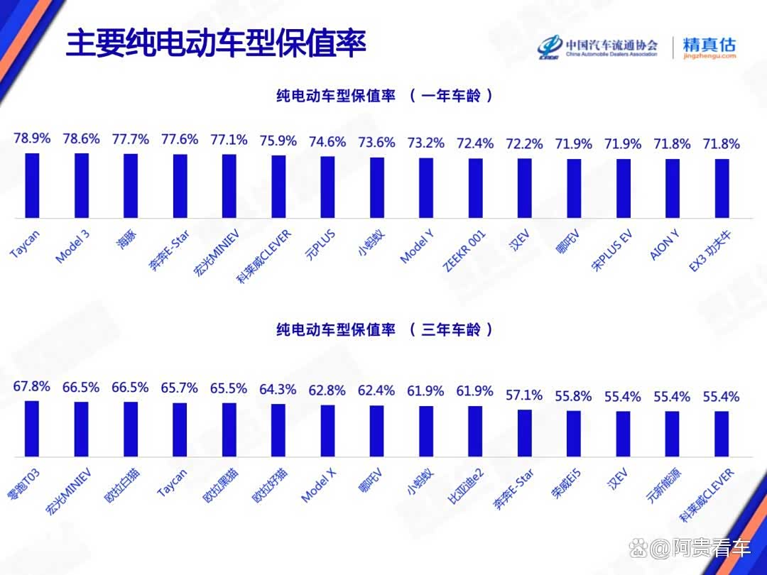 零跑T03(67.8%)、宏光MINIEV(66.5%)和欧拉白猫(66.5%)并列、保时捷Taycan(65.7%)4款车型则分别位居“纯电动车型保值率(三年车龄)”榜单前三。