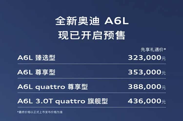 3月10日,一汽奥迪官方宣布,全新一代 奥迪A6L(参数|询价)正式开启预售。四款车型,先享礼遇价区间32.3-43.6万元。