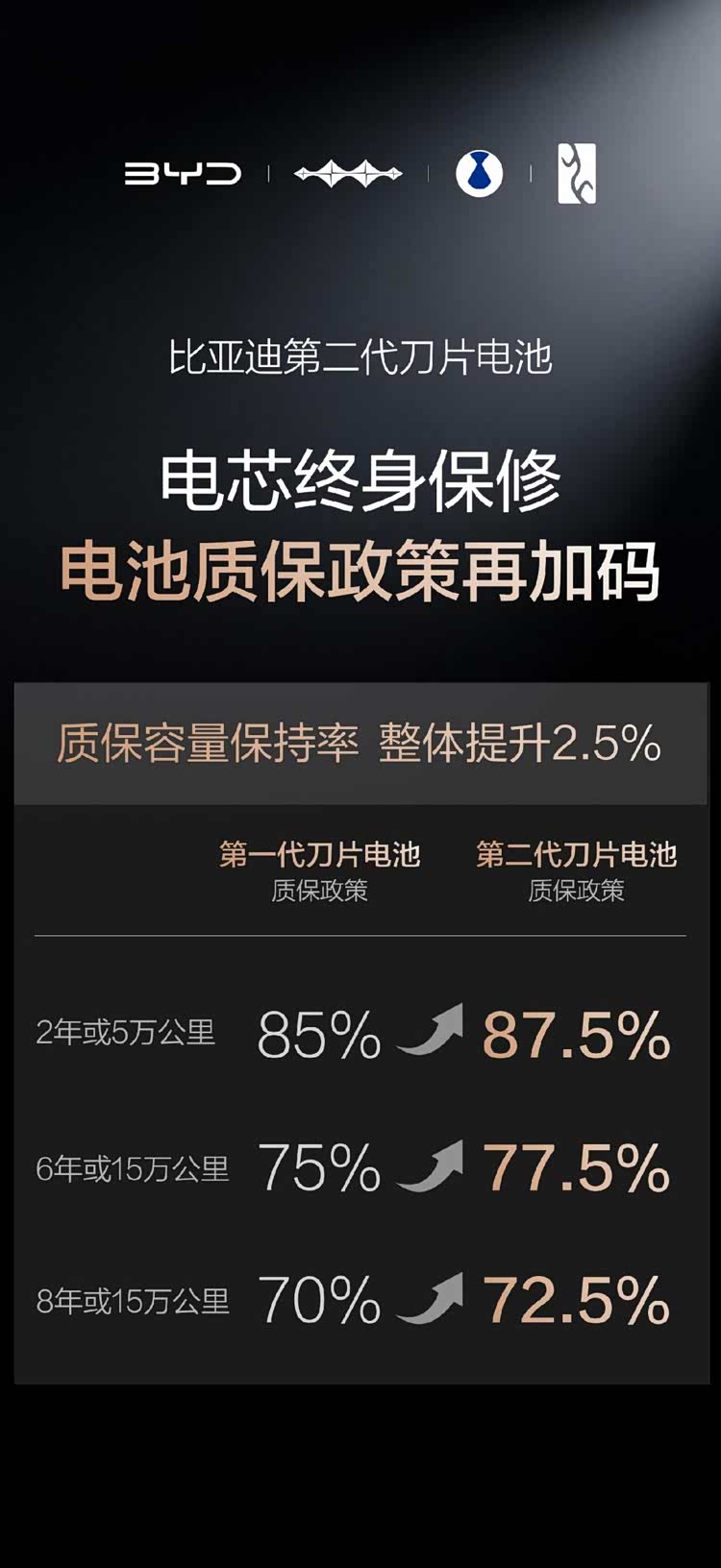 和第一代刀片电池比起来,第二代的寿命又提升了一大截,比亚迪对自己的产品特别有信心,直接把质保政策又加码了!官方明确说,第二代刀片电池质保的“容量保持率”提高了2.5%,把第一代75%的包换标准,提升到了77.5%——也就是说,只要电池容量低于77.5%,就能免费包换,电芯依旧是“终身保修”,这份底气,全来自比亚迪对第二代刀片电池长寿命的绝对自信,要是闪充真的影响电池寿命,谁敢做出这么实在的承诺?