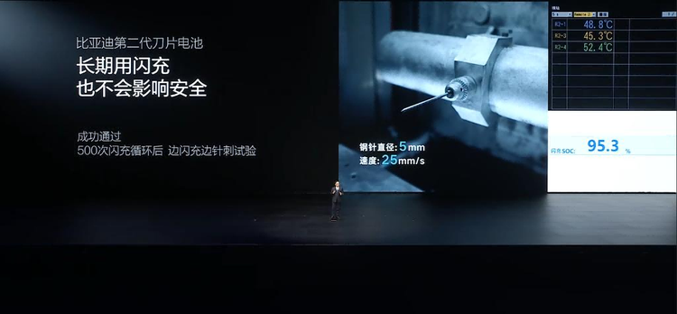 比如说第二代刀片电池先完成了500次闪充循环,之后又做了极端测试——一边闪充到96.4%的电量,一边用针刺电池,全程没有出现热失控,也没有冒烟、起火的情况。大家可以算一笔账,500次闪充循环,差不多相当于车子开了30多万公里,按咱们私家车一年开2万公里算,就等于电池用了15年,就算长期用闪充,它的安全性也一点不受影响。