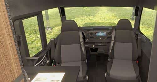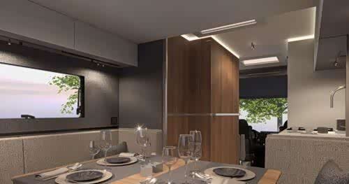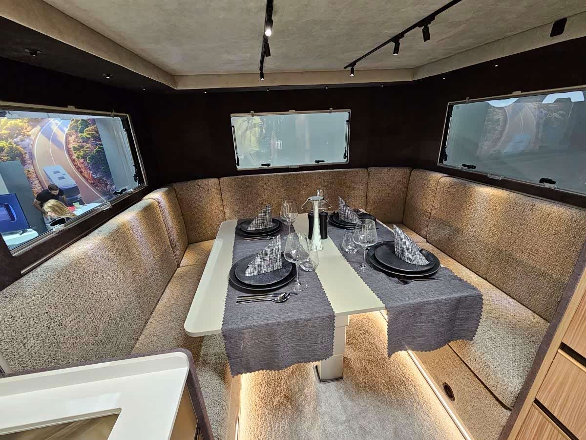 车内,我们依然被这款高端房车的设计所吸引。典雅的内饰通过深色调、高指向性灯光、棱纹木纹和白色表面展现出来。值得一提的是天鹅绒墙面和铝制厨房防溅板。有趣的是,前排座椅(棕色皮革)与后排客厅的灰色织物并不相配。但整体氛围始终保持一致,舒适舒缓。得益于宽敞的头部空间和全景挡风玻璃,车辆内部空间宽敞。另一方面,带有可折叠床的后部高度较低。这是车辆上市前将改进的方面之一:可折叠床将“紧贴”车顶。制造商向我们保证了这一点。