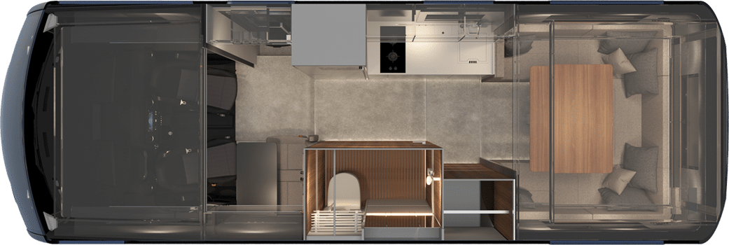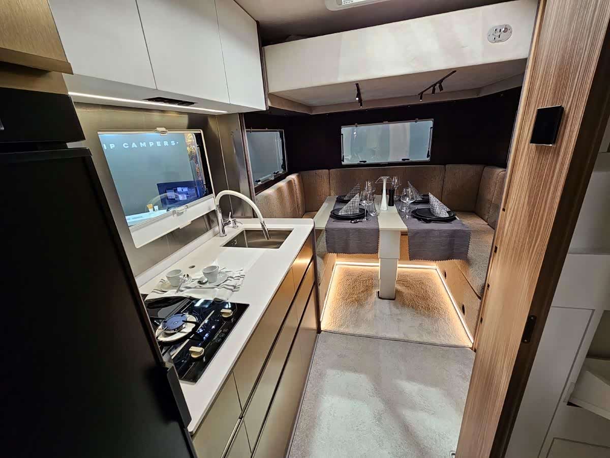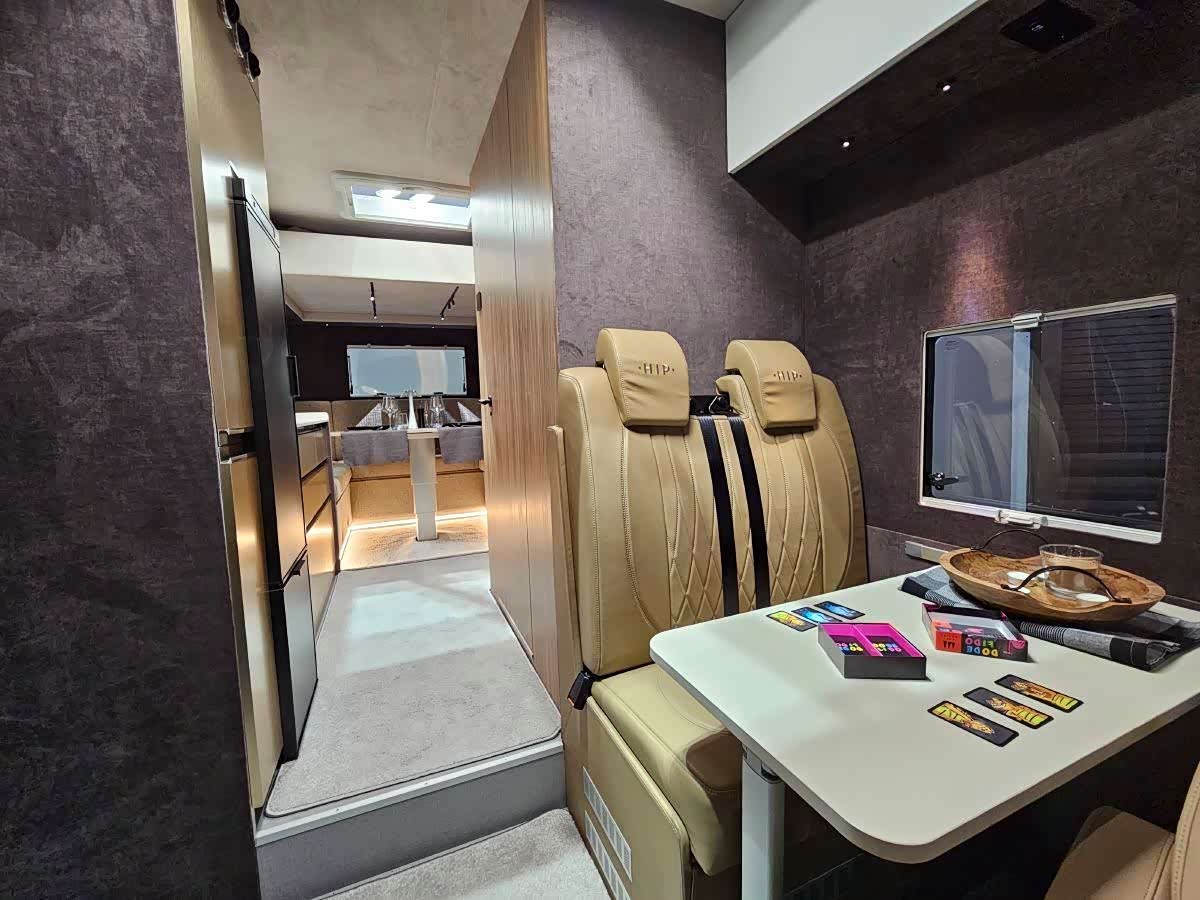 实用空间也毫不逊色。车厢两侧设有众多储物空间,包括入口处的加热鞋柜。厨房位于车辆右侧。“ 我们将其布置在侧遮阳篷的一侧;这也是一个非常重要的功能。大人们做饭时可以照看孩子,同时还能获得最佳视野。将卫生间布置在左侧也更加合理。 ”为了符合这款车的家庭用途,Hip Campers 提供了充足的储水空间(150 升)和一个大型冰箱(141 升)。在我们参观的车型上,家用燃气由液化石油气 (LPG) 钢瓶提供。但我们被告知,燃气灶可以用电磁炉或柴油灶代替。