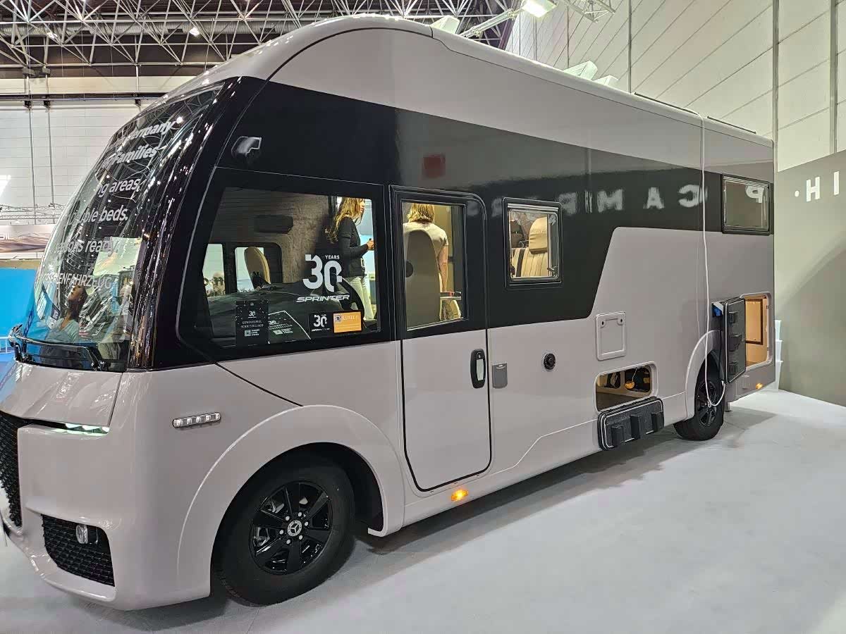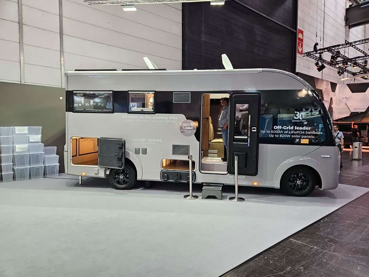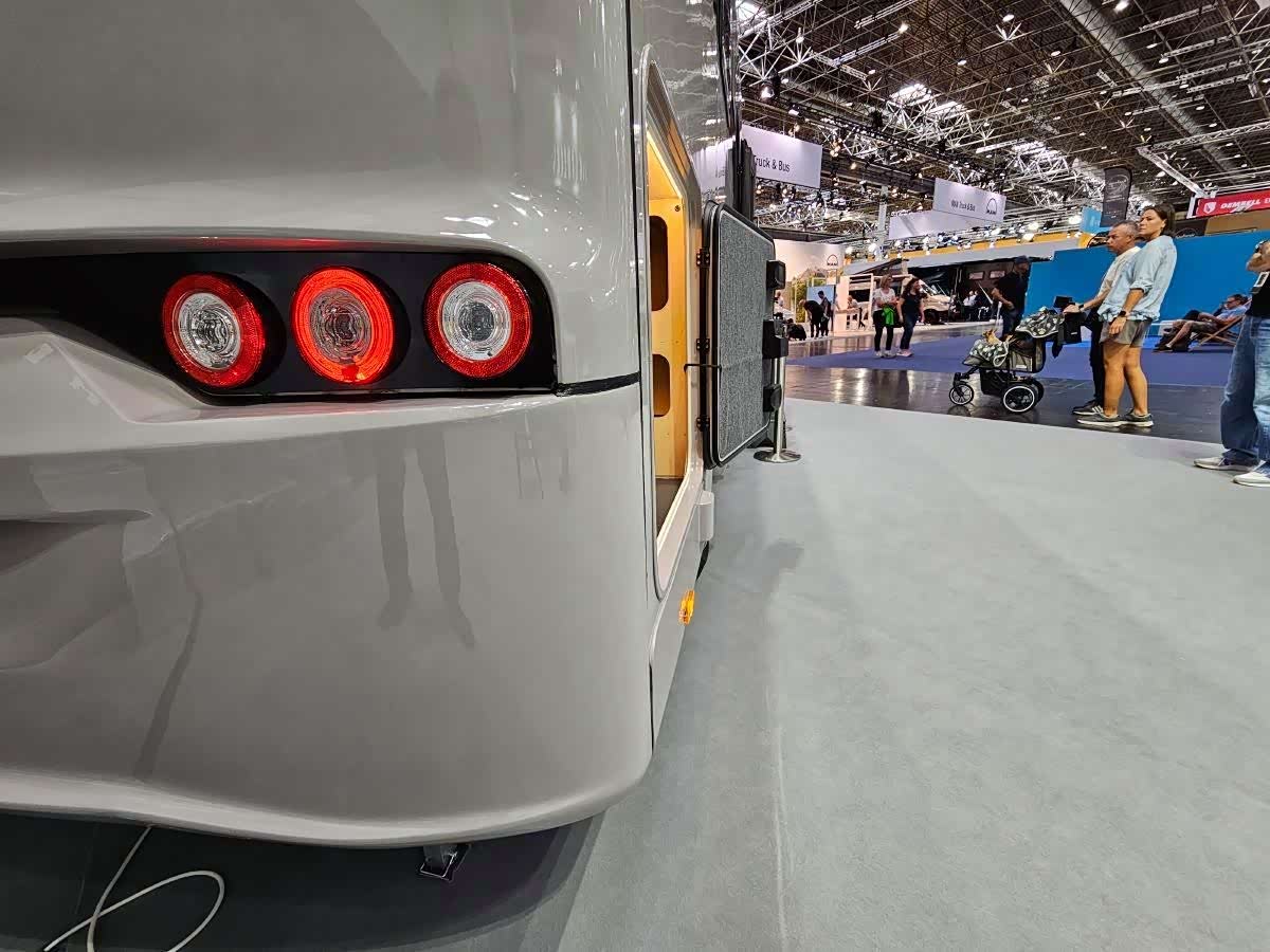 首先,它的外观设计与2023年发布的3D模型相得益彰。圆润的车头,纤细的前大灯,环绕着巨大的黑色格栅。车尾也极具风格。总的来说,这款露营车的轮廓气势恢宏。“ 我们定位于该系列的顶级车型,”我们的联系人解释道, “但同时保持了较小的尺寸。我们紧凑却宽敞。 ”事实上,长度保持合理(7.20米),而这款露营车的突出之处在于其高度(3米)。