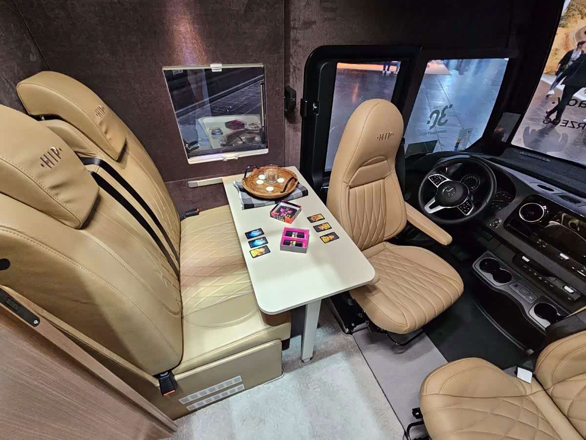 最终成果就是这辆Hip Campers房车,它后部有一个宽敞的U形起居室,一张折叠床可以向下折叠到起居室里(仅限Maxi顶配车型;其他车型的餐桌椅均可折叠)。前部是一个面向道路的双人长椅和一张折叠床。说实话,后部有一张双人床,前部有一张折叠床,这在我们看来并没有什么新意。事实上,市面上几乎所有A级房车都采用这种布局。我们甚至见过一些更偏向家庭的房车,比如后部设有带双层床的儿童卧室。但Hip Campers这辆房车却独具特色。
