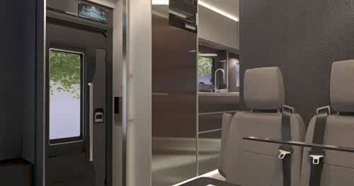 后部设有宽敞的休息室,前部设有面向道路的长凳座位,长度均为 7.20 米。