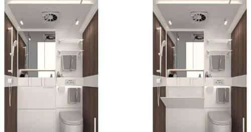 这辆露营车的独特之处之一是其125厘米宽的厨房,配备34 x 40厘米的水槽、141升的冰箱以及一个似乎是标配的烤箱。对面是一个140厘米高的衣柜,配有挂衣空间和抽屉。浴室也很宽敞,宽度为120厘米。水槽可伸缩,但淋浴时无需对这间浴室进行任何改造。