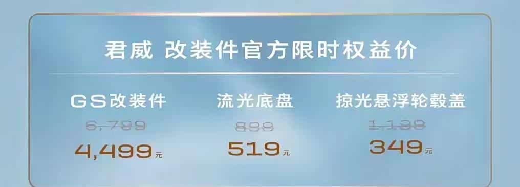 4月26日,我们从上汽通用别克官方获悉, 别克君威GS(参数|询价)改装套件现已正式上市,价格为6799元,限时权益价4499元,同时还提供流光底盘(价格899元,限时权益价519元)、掠光悬浮轮毂盖(价格1199元,限时权益价349元)给用户选择。前述改装件适用于2024款及后续别克君威车型,其中限时权益价截止时间为2025年5月5日。作为参考,在售2024款别克君威可选25T超享版、28T纵享版等两款配置车型,官方指导价15.98万-17.58万元,一口价10.69万-12.39万元。