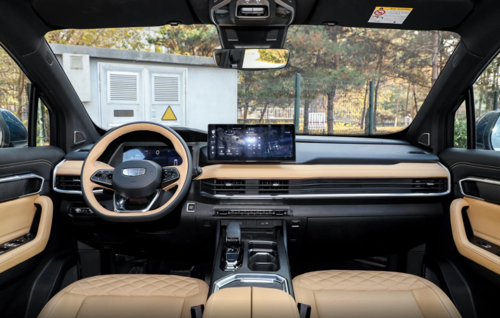 如果说吉利豪越L的外观是霸气和运动为主,那么它的内饰就是以简洁风格为主了,其中控台采用了T形设计,并且在车内只保留了少部分的实体按键,同时在空调出风口方面也采用了贯穿式设计,并且在用料方面也是较为讲究,大量搪塑材质的应用,增强新车内饰的质感,而且得益于较大的车身尺寸,新车前排的储物空间也是相当的丰富,足以支撑用户放置一些大小物件。此外,吉利豪越L还采用了10.25吋的数字仪表和12.3吋的中控屏幕,也达到了行业领先的水准,再加上全新设计的电子档杆,让新车内饰的高级感更上一层楼。