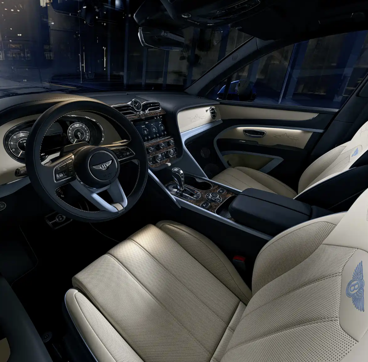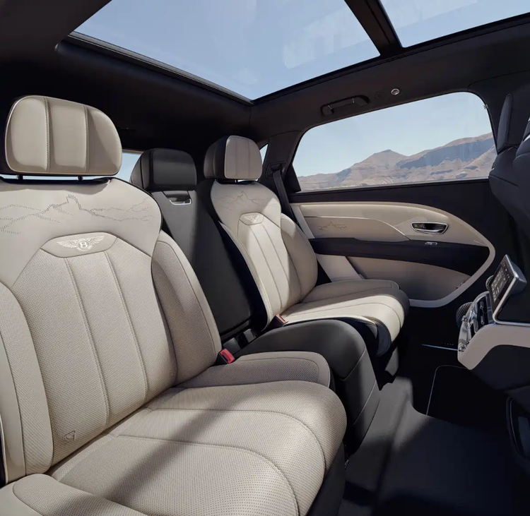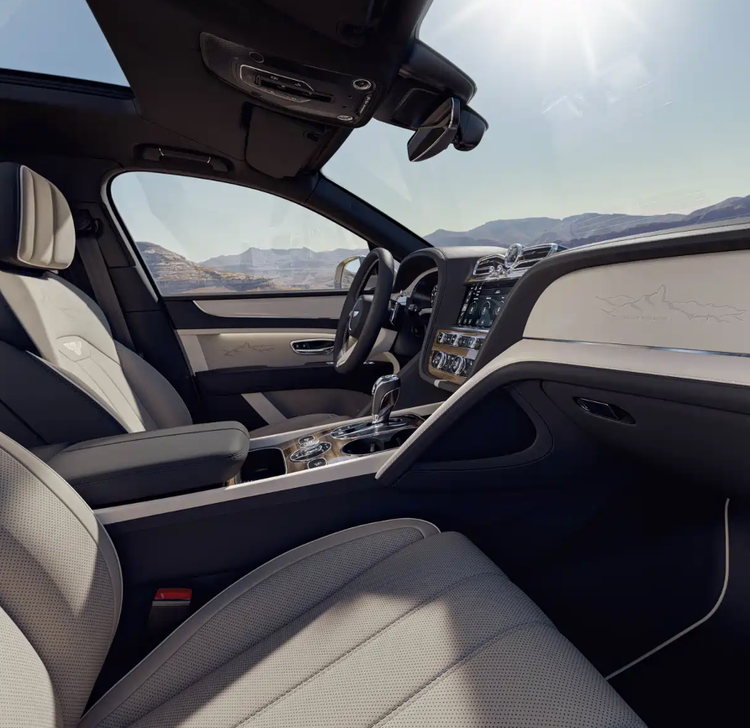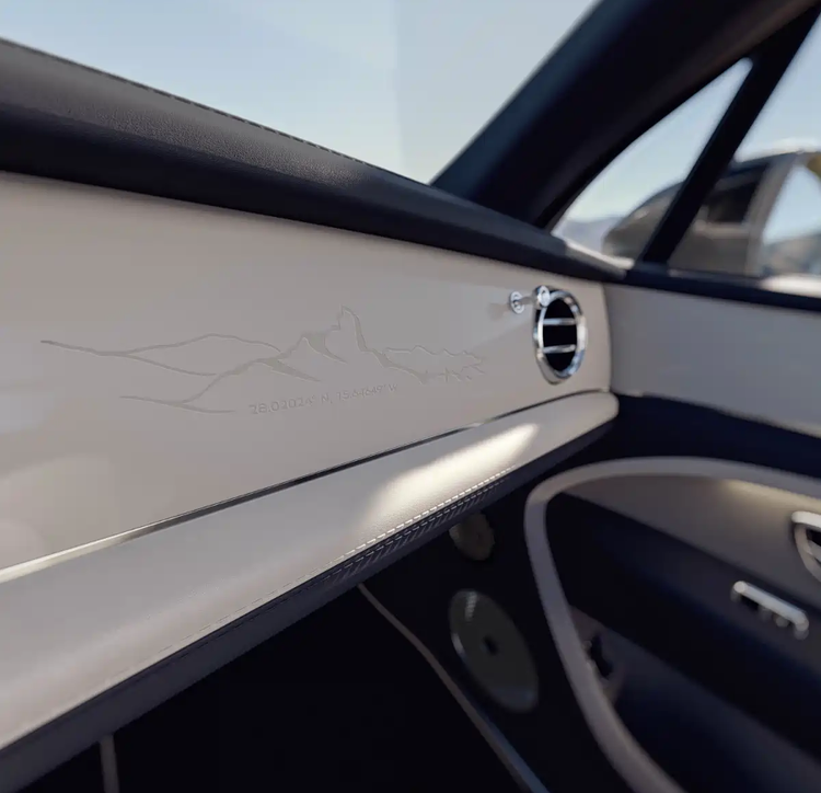 新车提供八款外观配色,标配22英寸MULLINER轮圈,采用灰色喷漆搭配抛光辐条内侧设计,还可选装全新的23英寸Super Lux轮圈,满足不同用户的个性化需求。内饰方面,云境版提供三种配色方案,专属配置包括独特的“Roque Bentayga”山峰图案。该图案以蚀刻工艺呈现于仪表板,并通过激光穿孔工艺镌刻于座椅与车门之上。