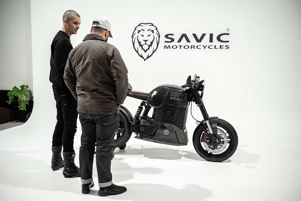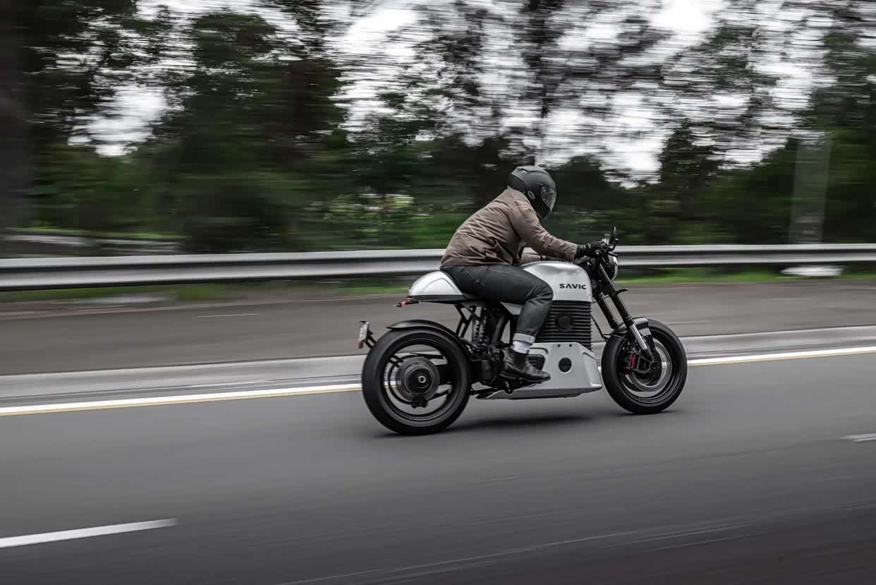 自 2016 年以来,他和他的团队一直在开发Savic C 系列 Alpha,这是一款澳大利亚组装的电动咖啡赛车,风格怀旧,但内含科技驱动的内核。C 系列 Alpha 呈现出经典的轮廓(带有迷人的单侧摆臂),但它没有使用常规的燃油发动机,而是用 SM1 动力传动系统代替了常规的燃油发动机,该系统拥有 16.2kWh 电池和 PMAC 电机,可提供 200Nm+ 的扭矩,续航里程为 200 公里,0-100 公里/小时加速时间为 3.5 秒。上个月我骑过它,感觉快了很多。切换到运动模式,转动油门,你会以几乎可怕的速度向前推进,而且几乎没有声音。
