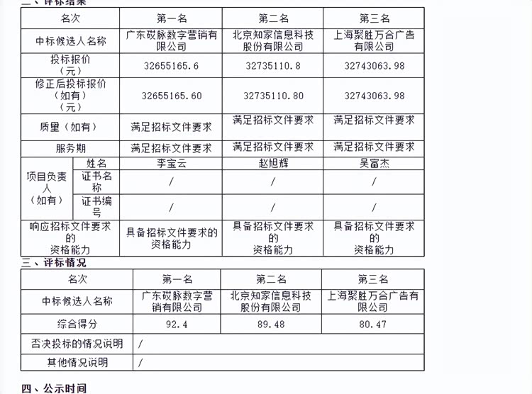 北京知家信息科技股份有限公司以3273.51万元(32735110.8元)报价排在第二中标候选人之位;上海聚胜万合广告有限公司以3274.31万元(32743063.98元)报价排在第三中标候选人之位,两家公司无缘该项目。