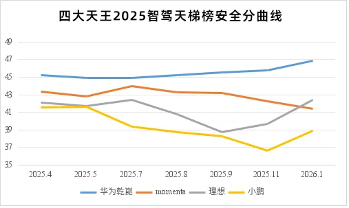在2025年度中国智驾天梯榜排名中,华为乾崑是年度总冠军,尽管自2025年5月开始,智驾大赛的比赛难度大幅提升,但即便如此,华为乾崑智驾的安全表现,仍然稳稳上扬,年度总得分超过45.5分(满分50分),2026年1月得分逼近47分,明显拉开了和第二名的距离。