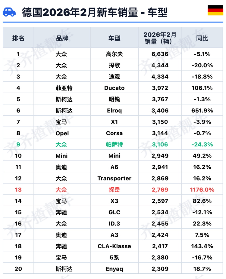 斯柯达继续高歌猛进。轿车明锐微跌1.3%,排名下跌2级站在第5的位置。斯柯达车长约 4.49米的纯电紧凑型SUV Elroq表现抢眼,销量同比增长651.9%,创下历史新高,并跃升2级至车型榜第6位,成为德国市场销量最高的纯电动车。