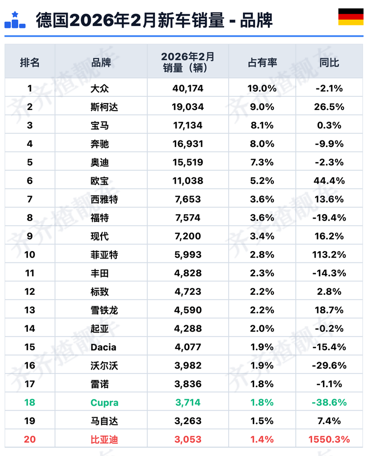 2026年2月德国当月新车销量(注册量)达到 211,262辆,同比增长 3.8%。不过按年看依然是负增长。2026年1-2月销量同比下降1.4%,为405,243辆。