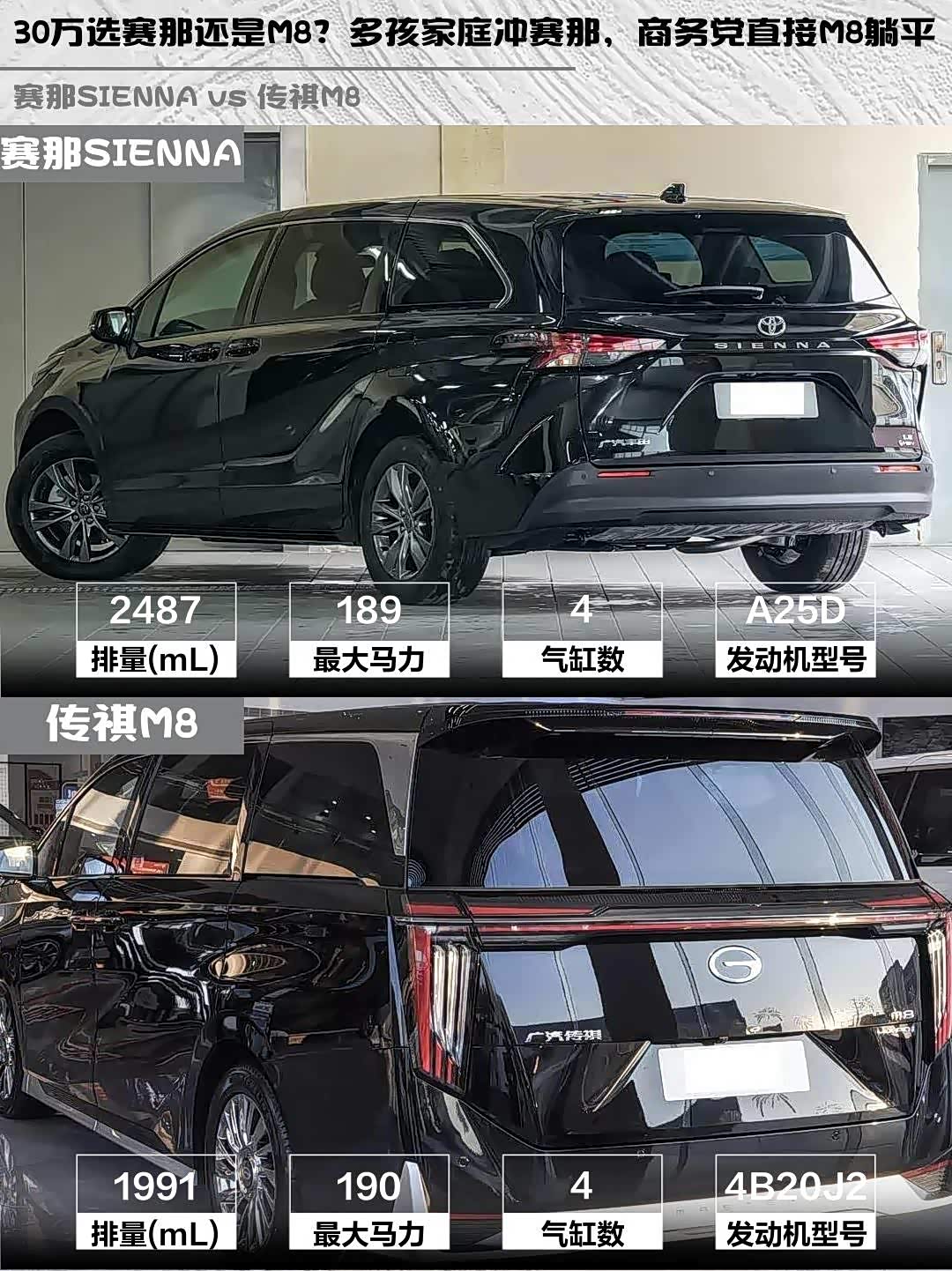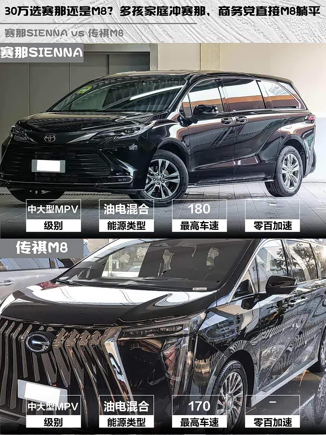 最近在选家用MPV的朋友看过来!今天深度对比两款热门车型: 赛那SIENNA(参数|询价) 2026款 2.5L双擎两驱舒适版 vs 传祺M8 2025款宗师系列超级混动版,都是30万级混动MPV,但性格完全不同!🚗💨