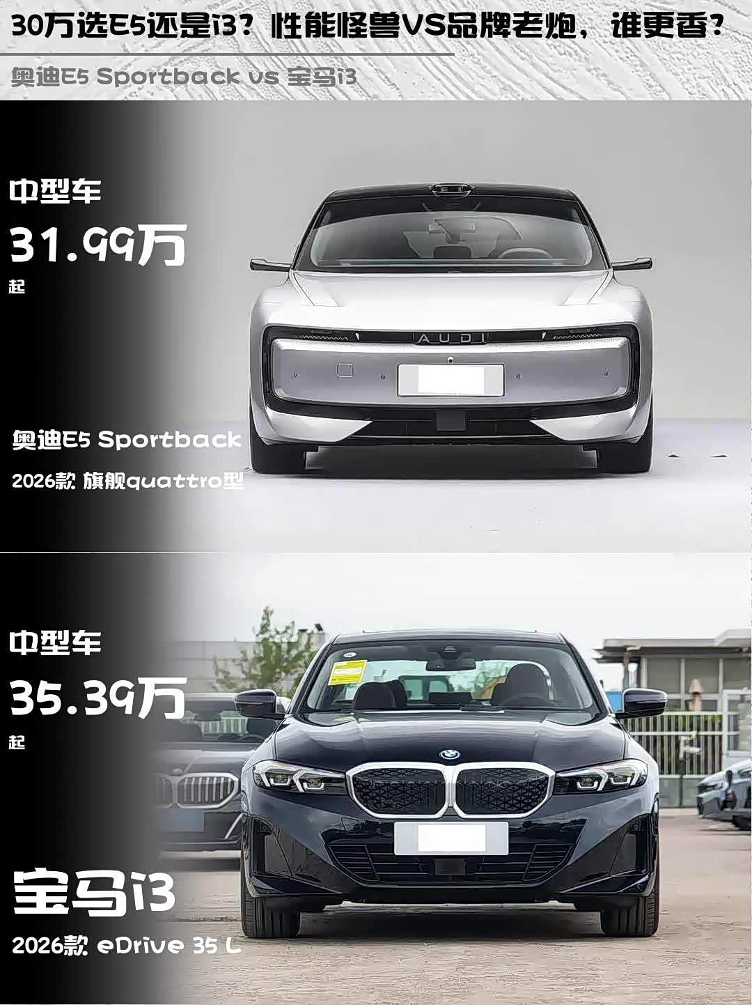 奥迪E5 Sportback(参数|询价) 2026款 旗舰quattro型 vs 宝马i3 2026款 eDrive 35 L,30万级纯电轿车怎么选?🤔