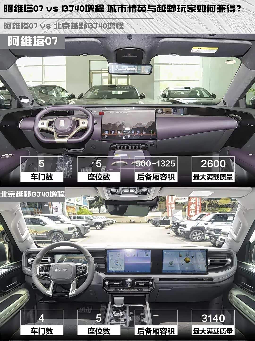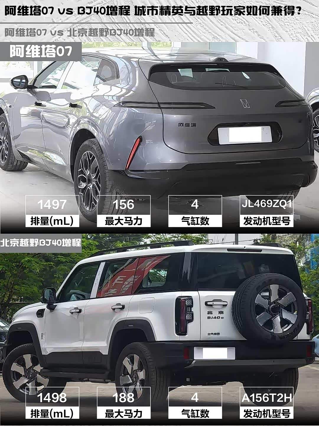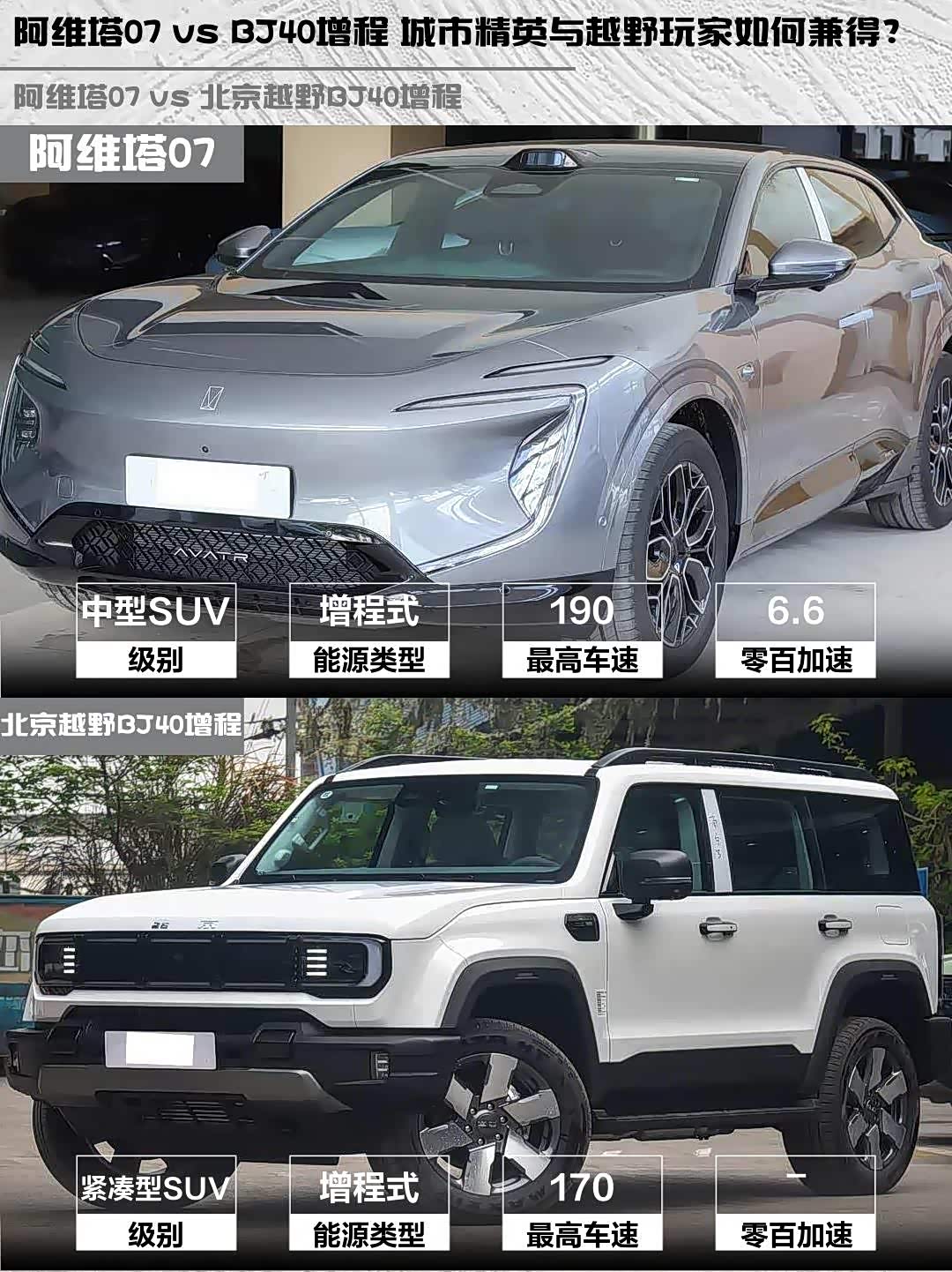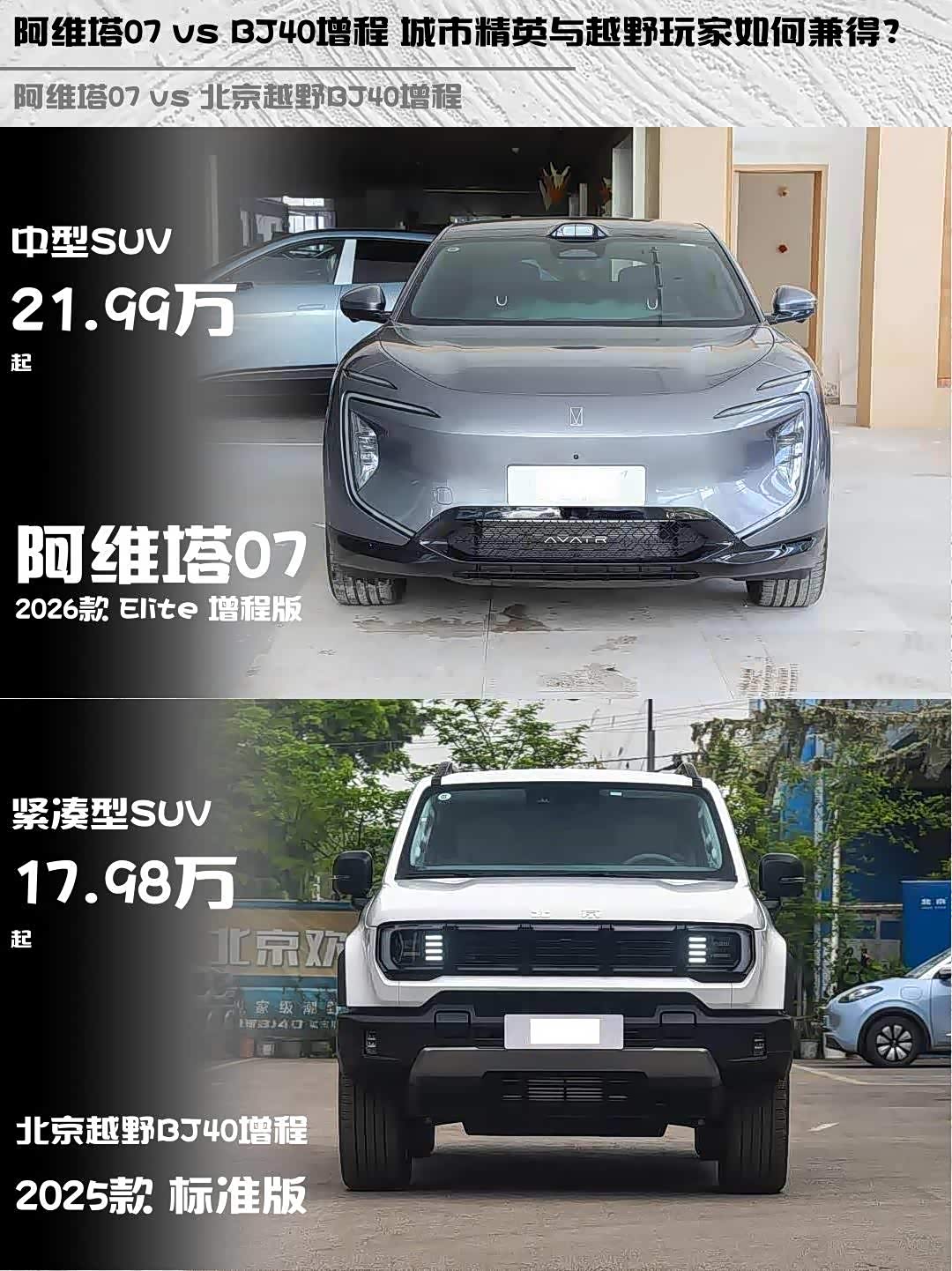 最近后台好多人在问阿维塔07 2026款 Elite 增程版和 北京越野BJ40增程(参数|询价) 2025款 标准版怎么选?作为深度体验过两台车的“老司机”,今天就从实际使用场景给大家唠唠这两台增程SUV的差异点👇