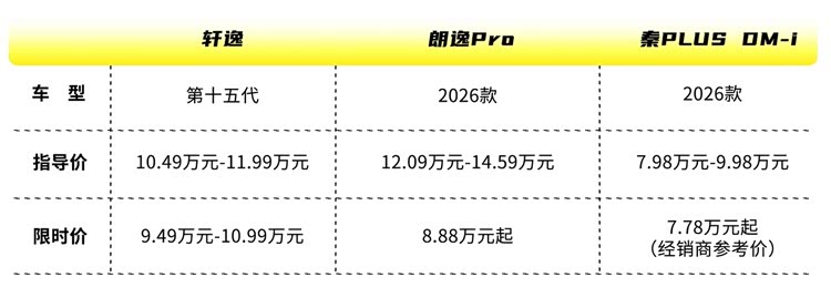 本次参与横向评测的具体车型分别为:第十五代轩逸、2026款朗逸Pro,以及2026款秦PLUS DM-i。