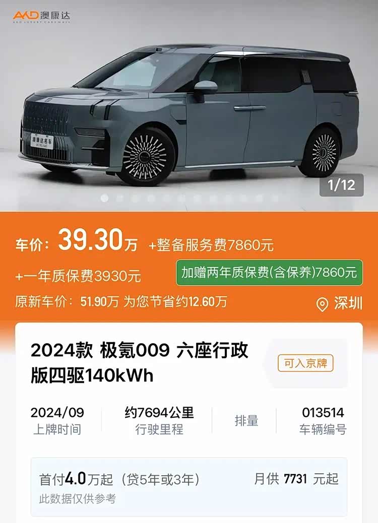 用不到40万的价格,你就能把这台2024款 极氪009(参数|询价) 六座行政版四驱 140kWh带回家。它最吸引人的无疑是其颠覆性的产品力:基于SEA浩瀚架构打造,搭载140kWh超大电池,CLTC续航里程可达850公里,配合超快充技术,长途出行基本告别焦虑。性能更是狂暴,双电机四驱系统带来了4.5秒的零百加速,让这个“大块头”开起来轻快迅猛。