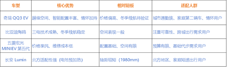 奇瑞QQ3 EV的焕新,本质是“情怀 + 实用”的双向奔赴:它保留了QQ系列亲民、灵活的核心基因,同时通过空间升级、智能赋能、安全强化,满足了当下消费者对小型车“不只是代步”的需求。盲订6.1万台的成绩,也印证了市场对其产品力的认可。不过对于消费者而言,需要考虑的是否与自己的需求相符。个人罗列了以下值得买的三种情况和谨慎选择的两张情况。值得买的三种情况:1.日常通勤≤50km,追求空间舒适与智能配置;2.家庭第二辆车,需兼顾短途出游与城市停车便利性;3.对奇瑞 QQ 有情怀滤镜,愿意为经典焕新支付合理溢价。谨慎选择的两种情况:1.预算低于6万,仅需基础代步功能(五菱宏光 MINIEV更具性价比);2.频繁跨城出行或北方用户,对冬季续航稳定性要求极高(比亚迪海鸥更稳妥)。说到底,QQ3 EV不是“全能冠军”,而是一款精准匹配“城市多场景实用需求”的车型。它的价值不在于颠覆市场,而在于为追求品质代步、看重空间与情怀的消费者,提供了一个均衡且有温度的选择。