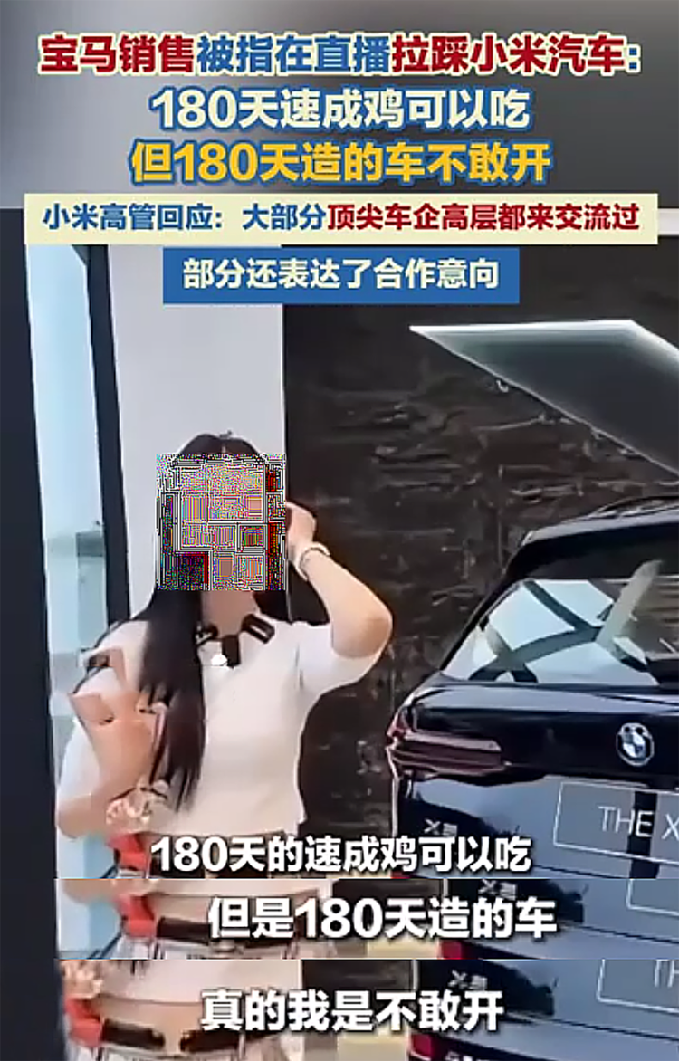 3月10日,一名宝马汽车销售人员在直播售车的时候,将小米汽车暗讽为“180天车”并称“180天的速成鸡可以吃但180天造的车真的是不敢开。”甚至以“杂粮品牌”讽刺小米汽车。这样的描述没有给予客观事实,缺乏对车辆实际体验的评价,更多是情绪上的主观恶意评价;宝马汽车、巴伐利亚发动机厂,其作为德国百年汽车制造商应当对其销售人员的言论负责,对于竞争竞品和产品应当保留有最起码的尊重,这是商业道德的体现。