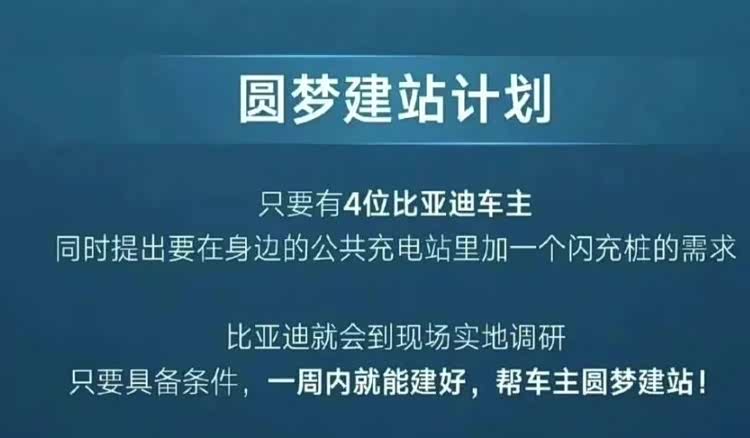 比亚迪除了在第三方桩上兼容性和充电效率双优之外,还推出了一个“圆梦建站”计划:只要凑齐四个比亚迪车主,就能申请在小区门口、在公司楼下建一个闪充桩。