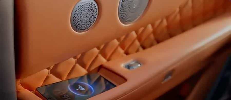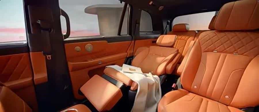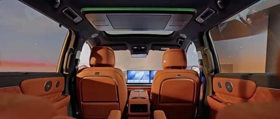 新车采用2+2+2的六座布局,着重提升后排乘坐体验。第二排座椅支持躺椅模式,并配备了可翻折的娱乐屏,边缘还嵌入了氛围灯带。在便利性配置上,前排及第二排扶手区域均提供了手机无线充电功能。