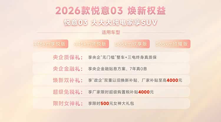 自去年上市后一汽奔腾 悦意03(参数|询价)便以月均3000台的销量,成为品牌继奔腾小马之后的第二支柱车型。现在一汽奔腾在产品力上继续加码,2026款悦意03推出两种续航共6款车型,官方售价 7.98-11.99 万元,相较老款,入门版价格不变,部分中高配上涨2000/5000元,长续航高配下调3000元。