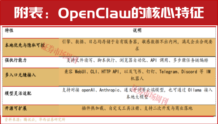 对此,华西证券认为,OpenClaw被设计为可代替用户执行任务的自主人工智能虚拟助理软件,而非只是对话式聊天机器人。OpenClaw可以认为拥有“双眼和双手”,可直接操作电脑、浏览器、调用API,完成各类真实任务,具体包含:一是系统级操作(强执行能力),例如文件管理、终端执行、设备监控、代码开发;二是浏览器自动化,例如控制Chrome浏览器,自动浏览网页、填写表单、提取数据;三是办公自动化,例如邮件处理、日程管理、文档处理、表格处理;四是多渠道交互,例如无需专用App,通过WhatsApp、Telegram、Discord、Slack、iMessage等聊天软件即可控制;五是持久记忆与规划,例如记住你的偏好、历史任务,自动拆解复杂目标并分步执行;六是可扩展技能生态,官方技能市场有100+预置技能,支持用户自定义技能;七是模型灵活适配,支持Claude、GPT系列,也可通过Ollama接入本地模型,适配不同算力与隐私需求。