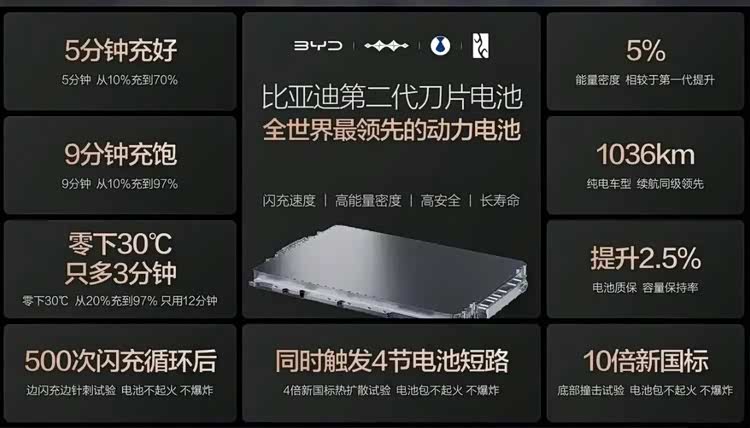 前不久,比亚迪正式发布第二代刀片电池及闪充技术,第二代刀片电池常温状态下可实现5分钟电量从10%充至70%,9分钟充至97%。这意味着电动汽车第一次在补能效率上,真正拥有了与燃油车平起平坐的资格。9分钟充满97%,这已经超过了加油的体验(考虑到你去加油站排队、付费、离开的时间)。