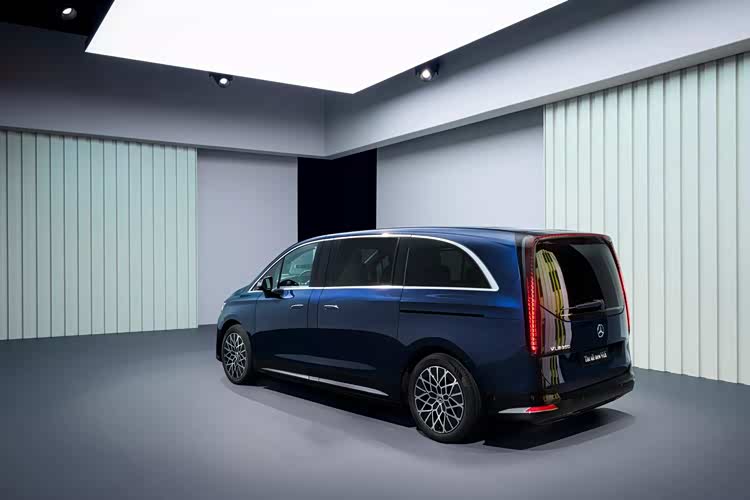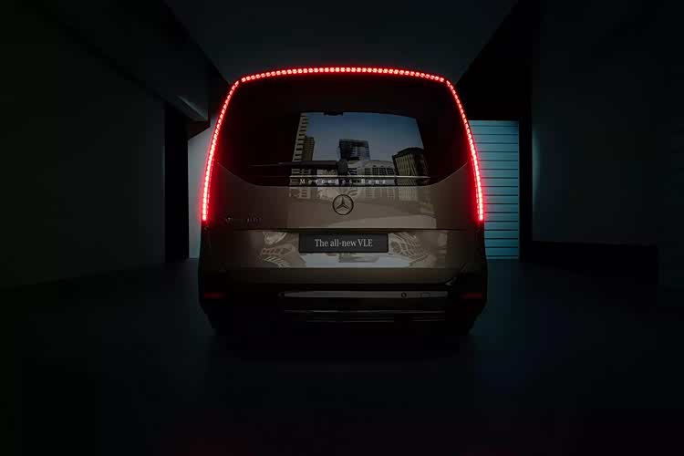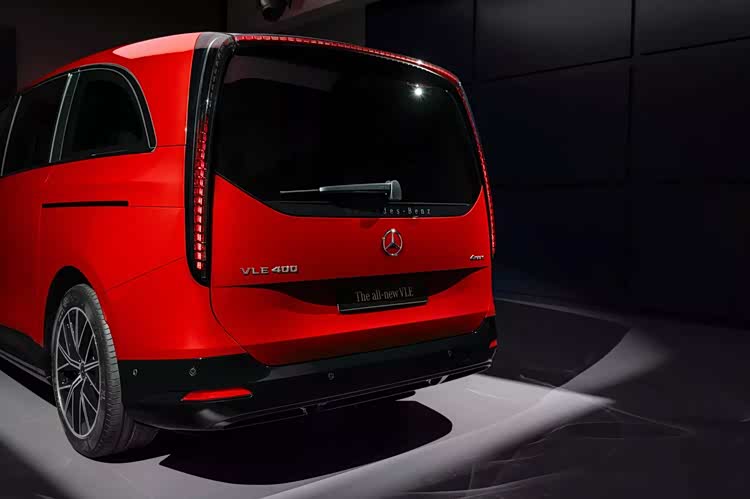 车身侧面,看得出全新的白车身和上一代V级截然不同,最为醒目的当属特殊的粗壮D柱造型,形成了有些溜背的视觉效果,这种元素在传统的欧系Van式车型上还真是并不多见,增强了活泼时尚的感觉,尤其是官方展示的橙色车漆更是提升了这一属性,其他诸如隐藏式车门把手、侧滑门,侧裙处镀铬条,大饼式轮毂等元素都不会缺席,符合奔驰的传统气质,给予了充分的豪华体验。而车尾部分最为醒目的当属尾灯设计,纵向的灯带镶嵌于车厢两侧,上方直接相连,形成了夸张的门洞式线条,有着极强的辨识度。