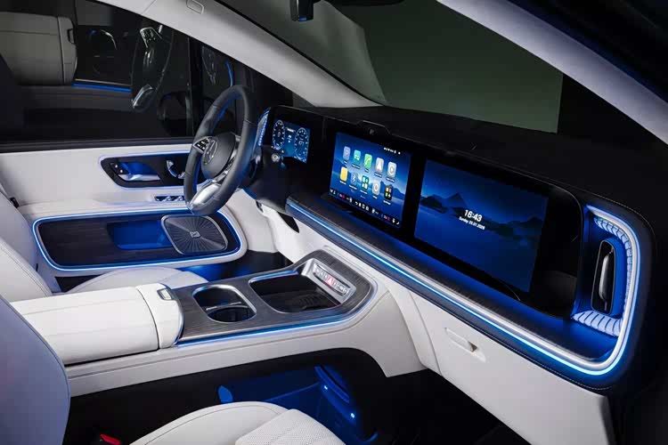 而后风挡则延续了V级的传统,有着向下突出的造型,中央镶嵌有字母标,后保险杠部分还有亮黑的装饰,让整车的风格形成统一,最终车身三围达到5309/1999/1943毫米,轴距为3342毫米,还将推出加长版本,长度达到5484毫米,轴距3517毫米,都有着相当夸张的水平,车内空间方面不需要担心。内饰部分,前排正像前文所述,同样采用了标准的家族风格,三悬浮式大屏造型,中央略带突出,应该是传感器和摄像头,Hud不忘添加,形成四屏联动,而中控台面加入了弯折的装饰和特殊的空调出风口设计,提升了豪华感。