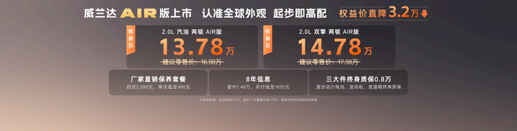 全新换代 威兰达(参数|询价)AIR版以全球设计为基底,通过配置、智能、动力的全方位升级打造产品硬实力,而入门满配的设定,让消费者以入门价格获得高价值配置体验。