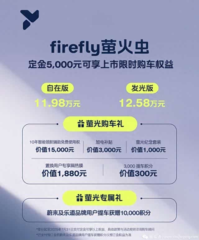4月19日,蔚来第三品牌firefly萤火虫首款同名车型正式上市,推出自在版和发光版两款车型,售价区间为11.98-12.58万元。作为蔚来面向全球市场的高端智能电动小车,萤火虫将共享蔚来销售、交付、服务网络,并计划于4月29日开启首批用户交付。