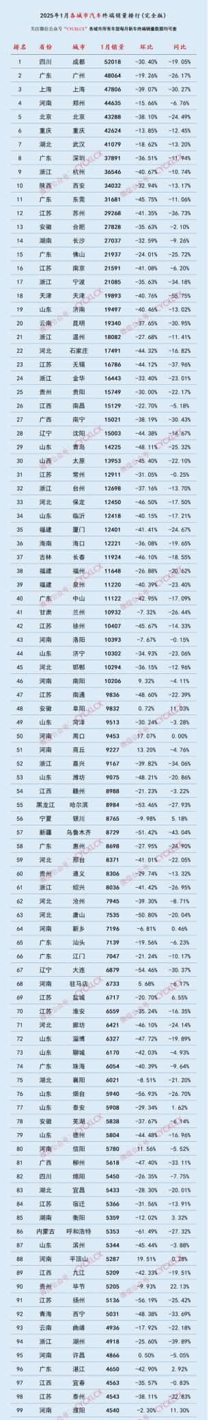 总体而言,2025年1月城市汽车销量情况既反映了各城市的经济发展水平和消费能力,也体现了汽车市场的竞争格局和发展趋势。未来,随着经济的发展、技术的进步以及消费者需求的变化,城市汽车市场将继续呈现出多元化和差异化的发展态势。