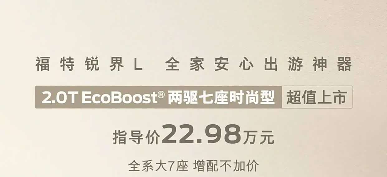 车家号·0浏览·2026-03-11 14:38 · 湖北8月28日, 福特锐界(参数|询价)L两驱七座时尚型上市,售价22.98万元。新车定位中型SUV,是2024款锐界L新增加的入门车型,与四驱版车型一样搭载2.0T发动机,售价低2万元。