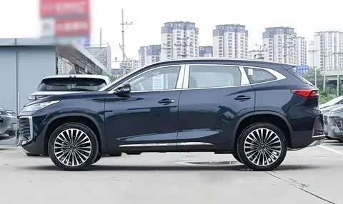 在侧面造型上,车辆呈现出略带弧度的车顶,搭配有坚固的行李架与独特的鲨鱼鳍设计,流露出强烈的力量感。分段式设计的腰线巧妙地勾勒出车身侧面的层次感。轮眉与侧裙部分采用粗壮的黑色饰板,进一步提升了整体的力量感。而轮毂则采用大气十足的密幅式设计,整体造型十分吸引人。