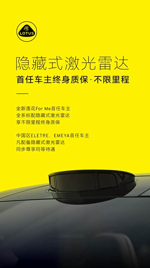 针对预售发布会前夕“头顶犄角”造型引发的热议,冯擎峰也在现场首次回应:“车辆的最终驾驶权必须回归于人,而当驾驶权属于人的时候,一辆车就必须忠实于纯粹。”为回馈用户信任,莲花汽车宣布:莲花For Me首任车主,全系标配的隐藏式激光雷达享受不限里程终身质保——这一配置历经全球80多个国家、2.9亿公里验证,故障率为零。中国区现有具备隐藏式激光雷达功能的ELETRE、EMEYA首任车主也可同步享受此权益。