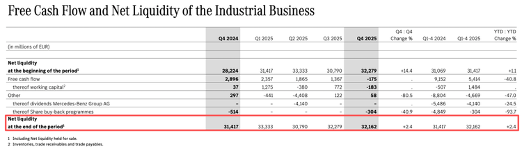 通过严格库存管理和精准固定资产投资,集团工业业务自由现金流依然达到54亿欧元(约合人民币432亿元),截至2025年12月31日净工业流动性增至322亿欧元(约合人民币2575亿元)。