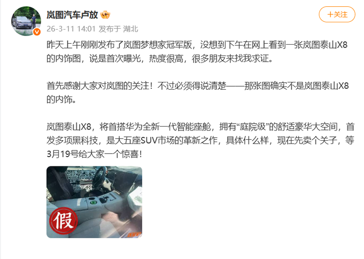 岚图汽车董事长卢放亲自辟谣,岚图泰山X8预计3月19日亮相