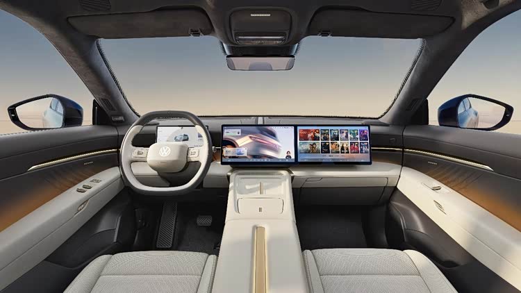 内饰部分,新车座舱采用环抱式布局,双幅式平底方向盘为双拼色设计,中央嵌入金色发光大众徽标,并集成电子怀挡、滚轮和实体按键。中控台搭载10.25英寸全液晶仪表,搭配由两块14.96英寸2.4K分辨率屏幕组成的双联屏,内置高通骁龙8295P车机芯片,可提供导航、车况及ADAS交互信息。副仪表台配备双50W手机无线快充、-5℃-50℃冷暖冰箱;中央扶手设有中轴对称金色装饰条,与车身外部金色中轴线相呼应。
