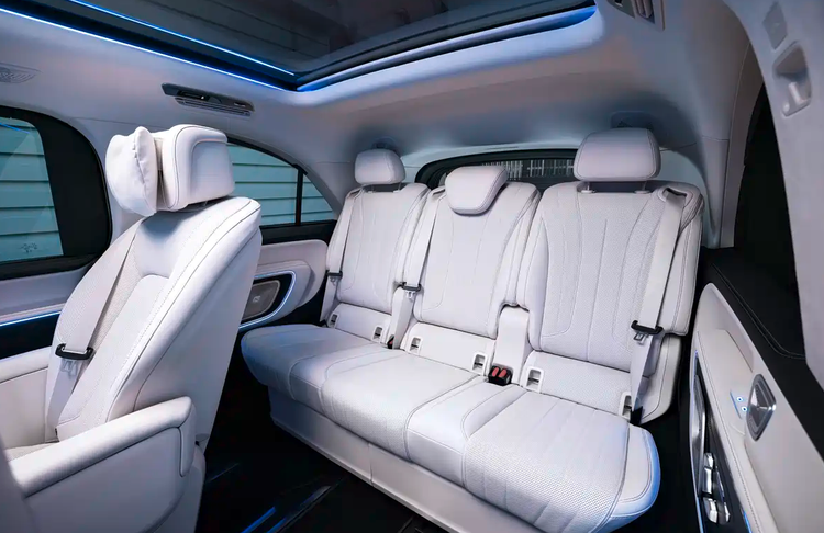 后排还可选装娱乐系统,一块31.3英寸全景屏幕从车顶展开,支持8K分辨率、分屏显示,并配备800万像素摄像头,可用于视频会议。此外,新车还搭载22扬声器Burmester3D环绕音响系统,以及带氛围灯的SkyView全景玻璃车顶。车内配备折叠桌板和多种储物模块,并配有手机无线充电、车载冰箱。