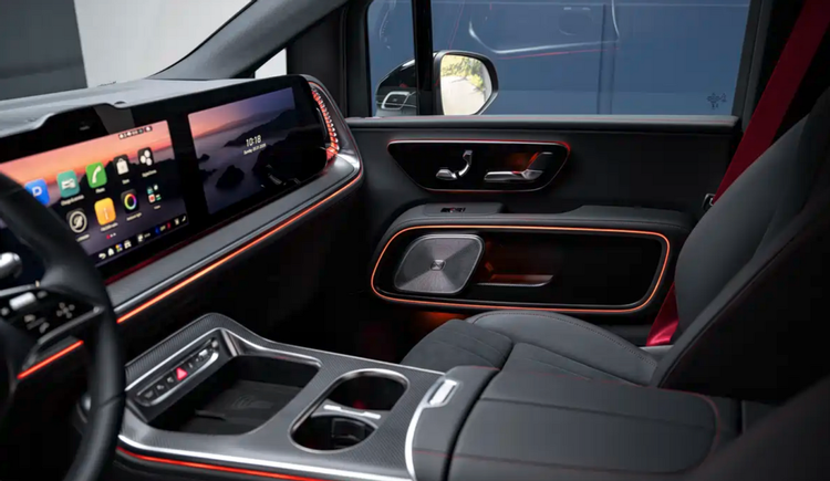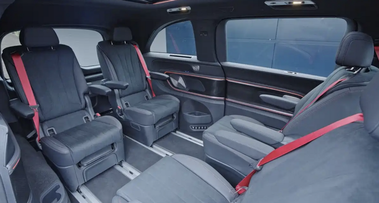 内饰延续奔驰经典豪华风格,三联屏座舱科技感拉满,但氛围灯开启后就不一样了。座椅提供5-8座布局,高配车型配齐“冰箱彩电大沙发”,即车载冰箱、舒适航空座椅,车顶搭载8K可折叠屏幕,部分版本第二排座椅支持旋转,满足多元场景需求。