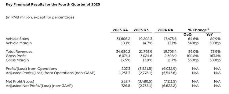 而远比单纯盈利数字更值得欣喜的,还是关键财务指标的结构性改善:Q4交付量达到124,807辆,同比激增71.7%,创下历史新高;营收346.5亿元,同比增长75.9%,规模效应进入加速释放期;整车毛利率跃升至18.1%,同比提升5个百分点,创下三年来新高;现金储备更是大幅增长近百亿至459亿元,财务安全边际大幅提升。